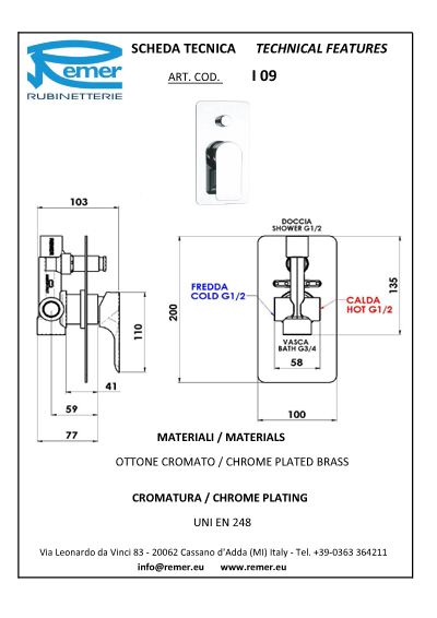OFFERTA MISCELATORE MONOCOMANDO VASCA/DOCCIA CON DEVIATORE I09 WINNER REMER